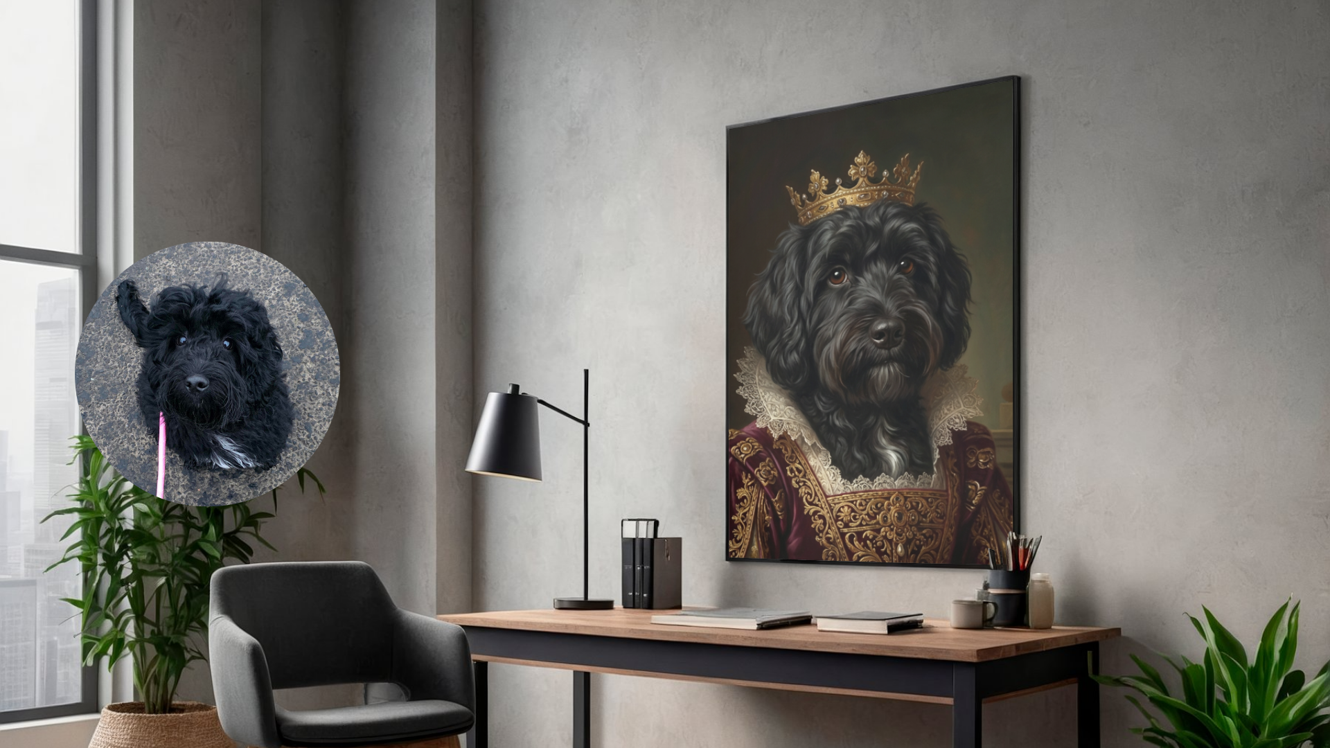 Your dog, reimagined as royalty. Upload a photo and we’ll transform it into a timeless royal portrait, printed on premium canvas and ready to hang.